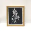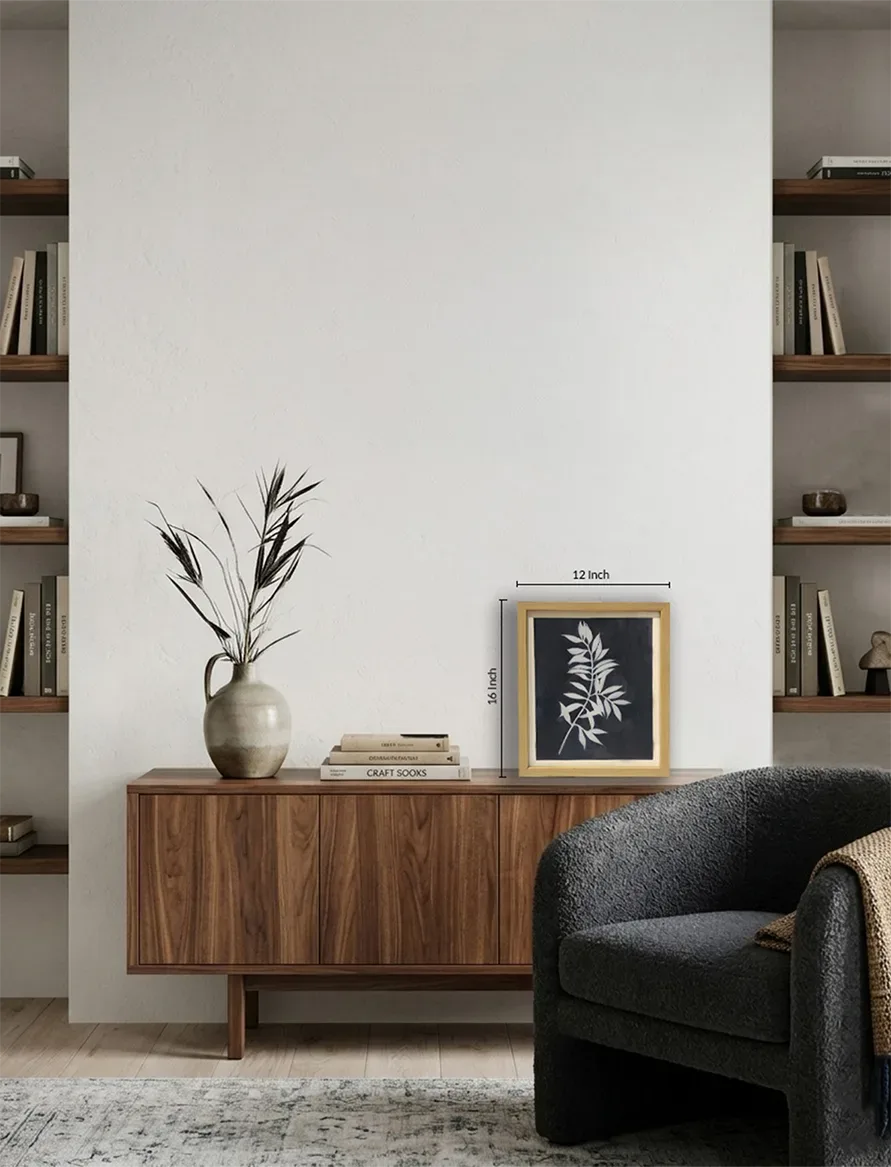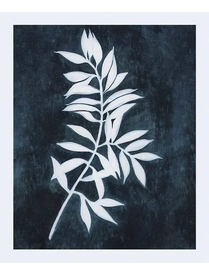 Graceful leaves in white silhouette on a textured blue background — a minimal yet striking frame for serene, nature-led styling.