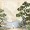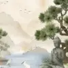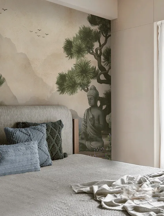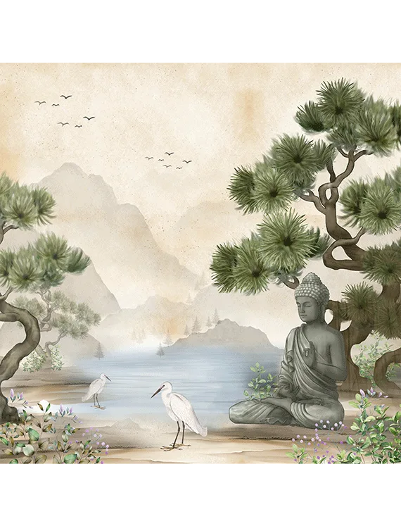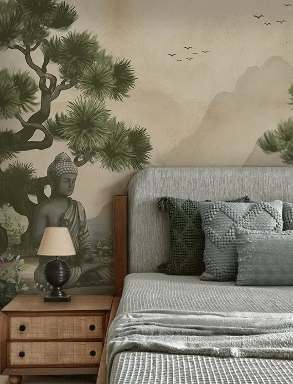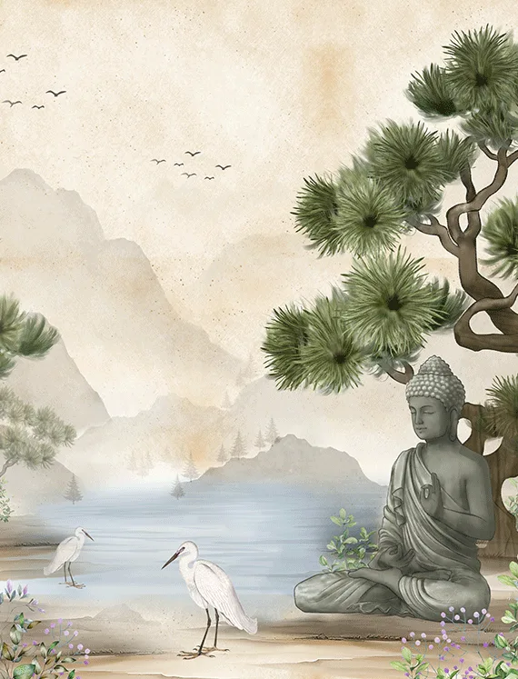 A serene depiction of divine harmony, this wallpaper features a peaceful Buddha as its focal point, this composition encourages reflection, mindfulness, and a profound sense of inner peace in any space.