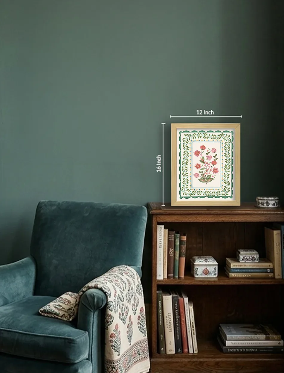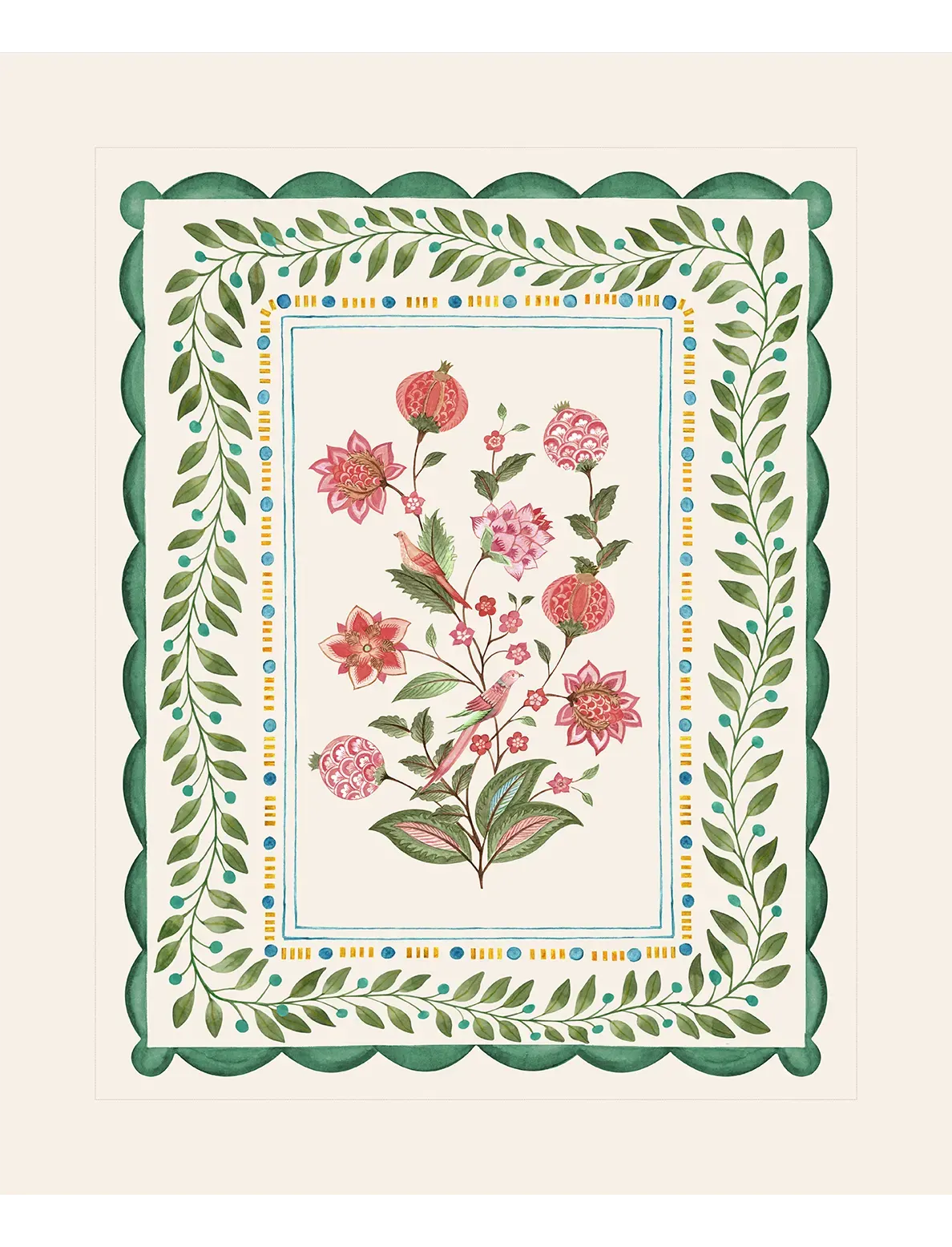 Layered with leafy arches and a playful floral core, this folk-inspired artwork captures the rhythm of traditional garden tapestries with a contemporary edge.