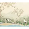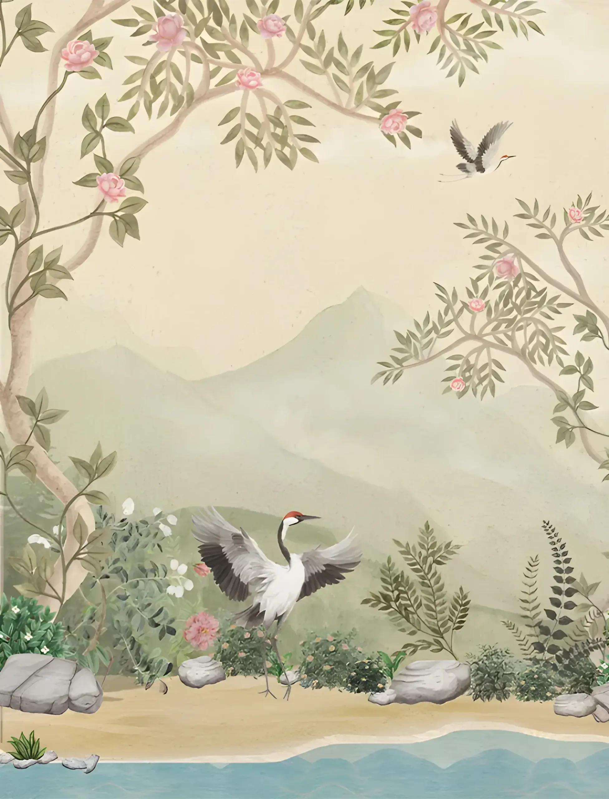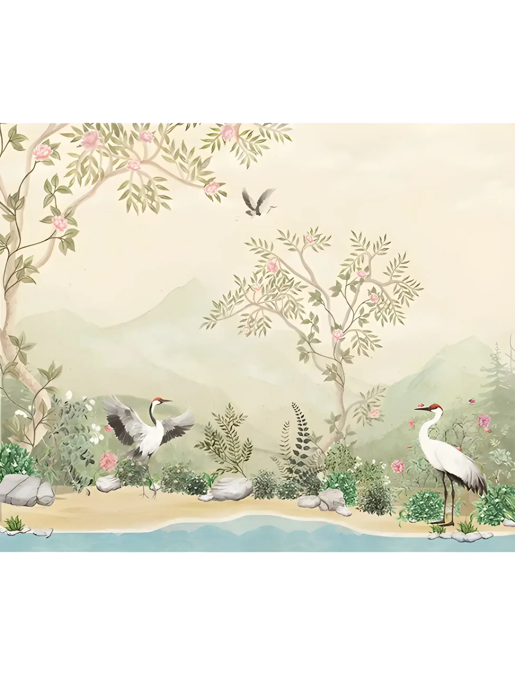 A hand painted masterpiece, this wallpaper evokes timeless elegance through its serene natural setting