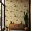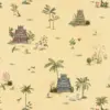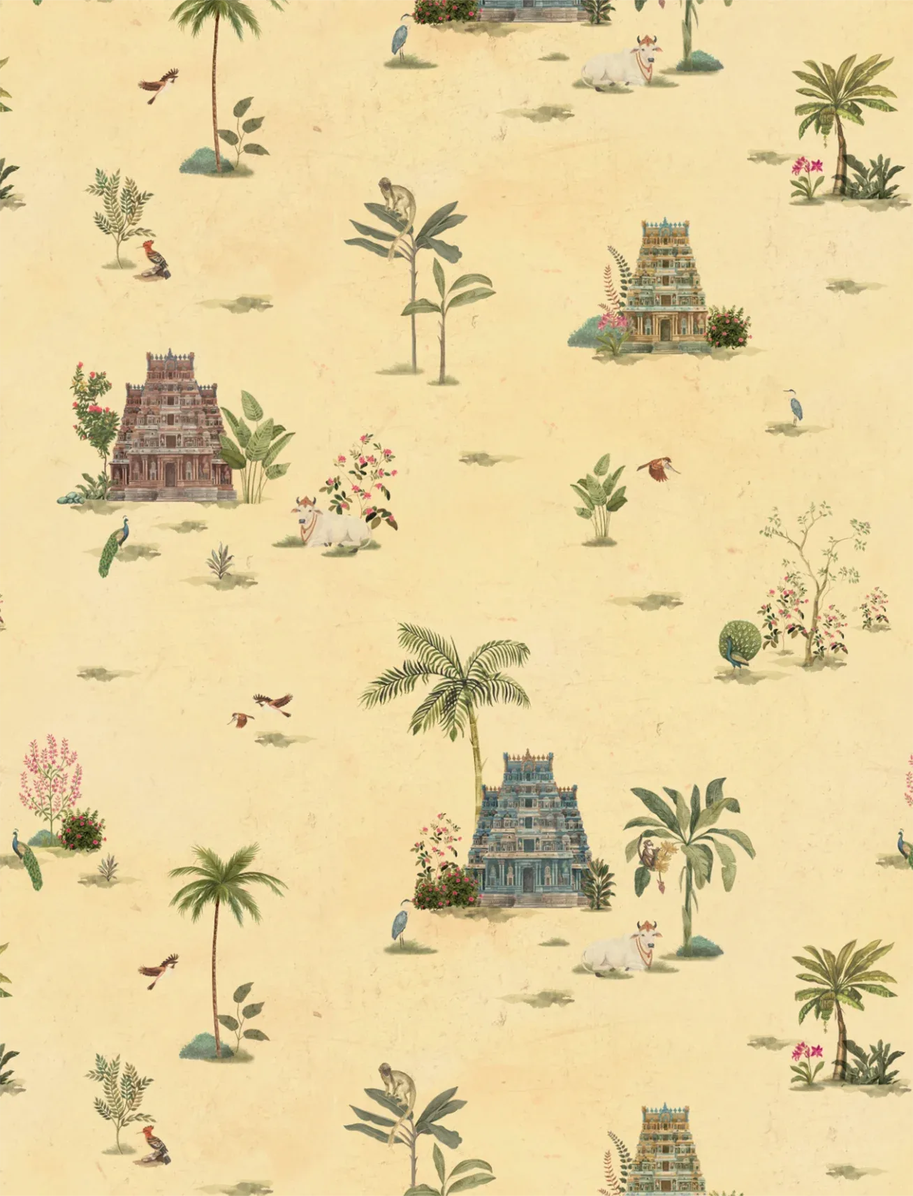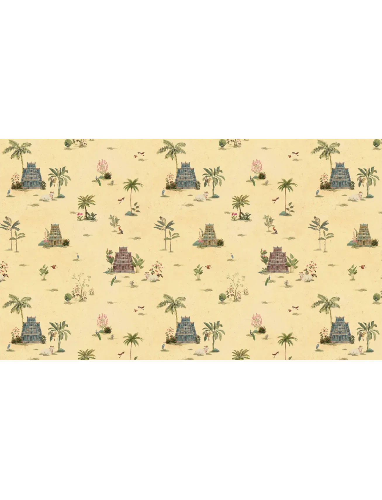 Serene yet detailed, this temple-inspired repeat weaves graceful structures with pastoral touches and lush greenery – a storytelling design that brings heritage charm and tranquil depth to your walls.