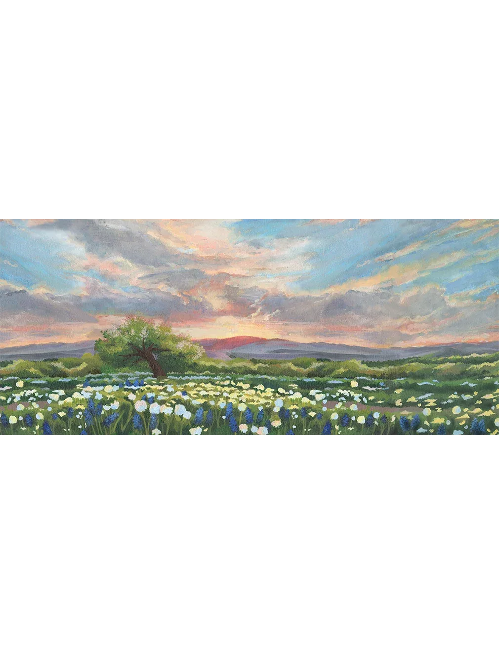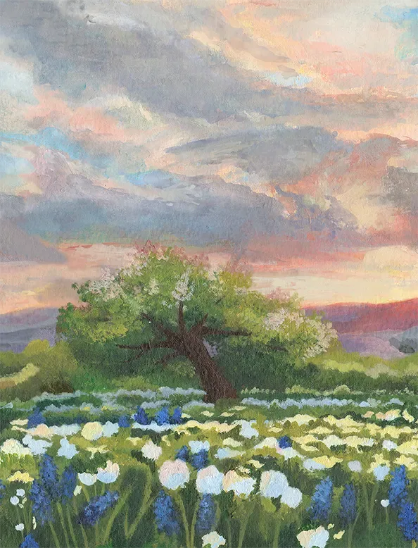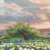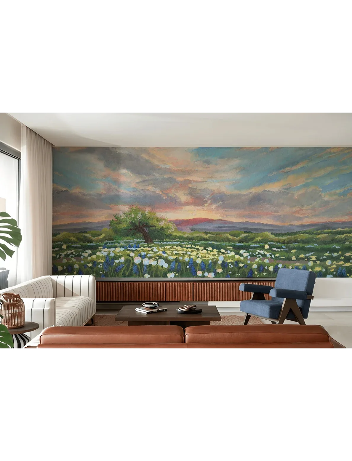 A bestselling hand-painted watercolour field, rich in colour and texture, unfolds around a solitary tree – an expressive landscape that brings warmth, depth, and artistic soul to your walls.