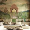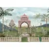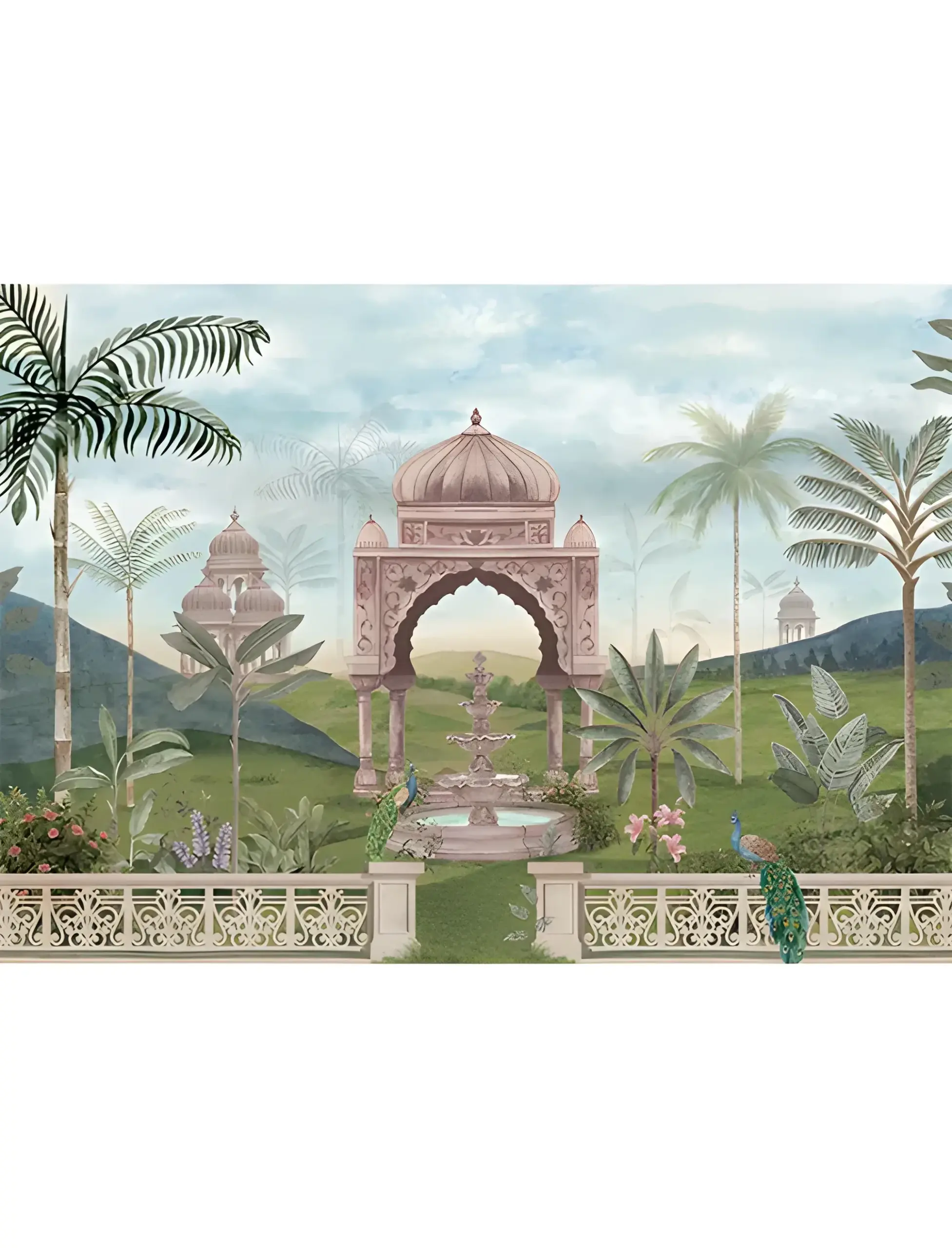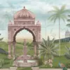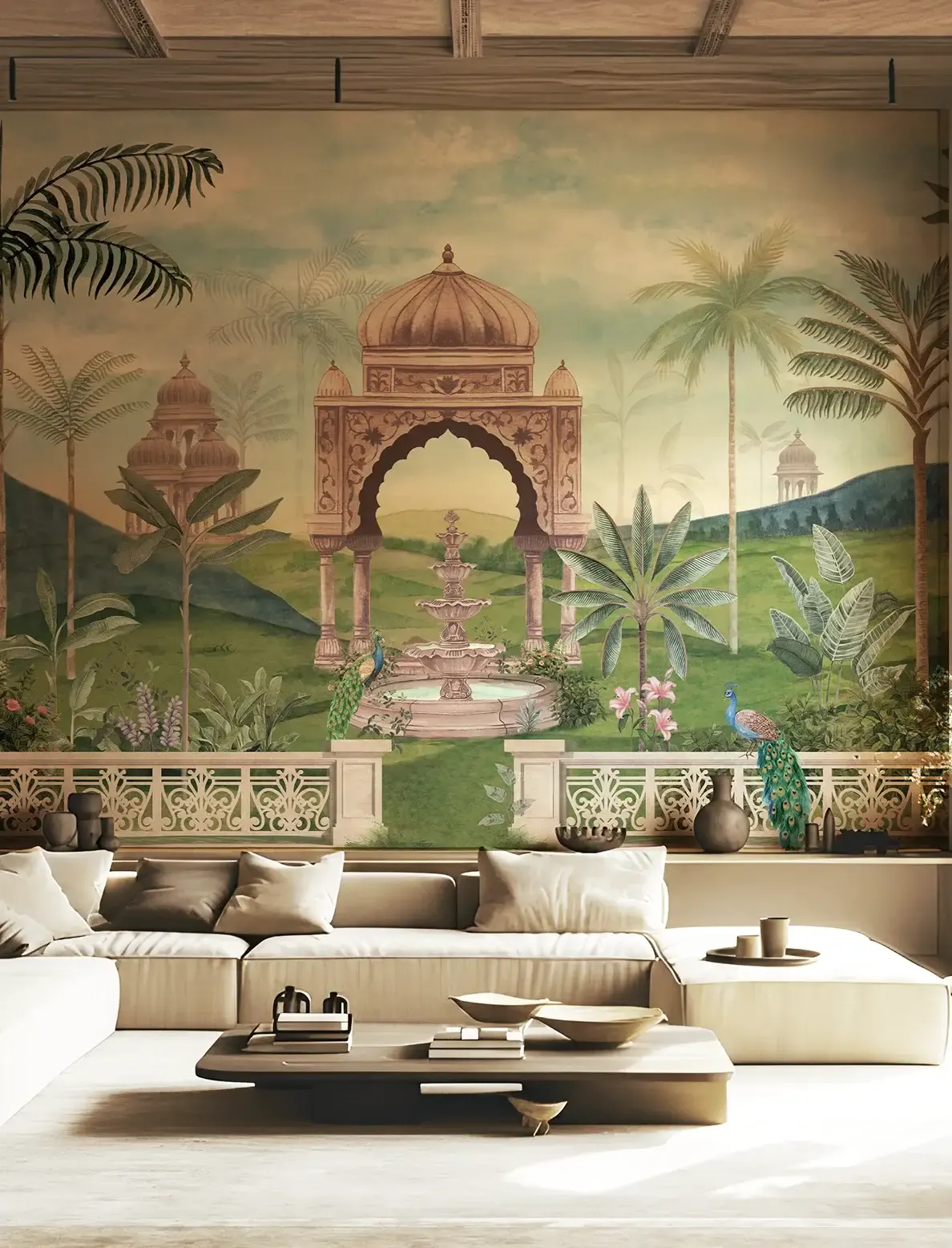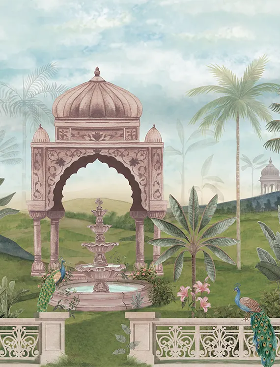 A layered architectural mural set amidst lush greenery, where structure and nature exist in quiet balance.