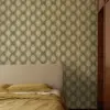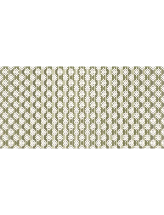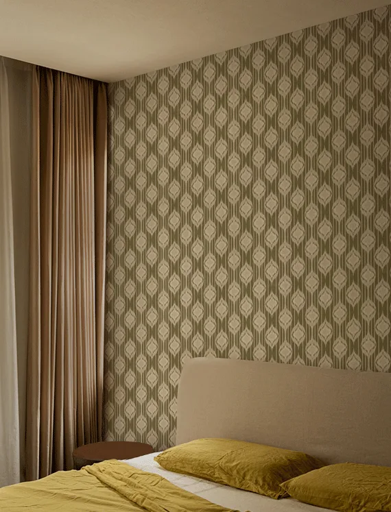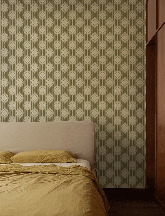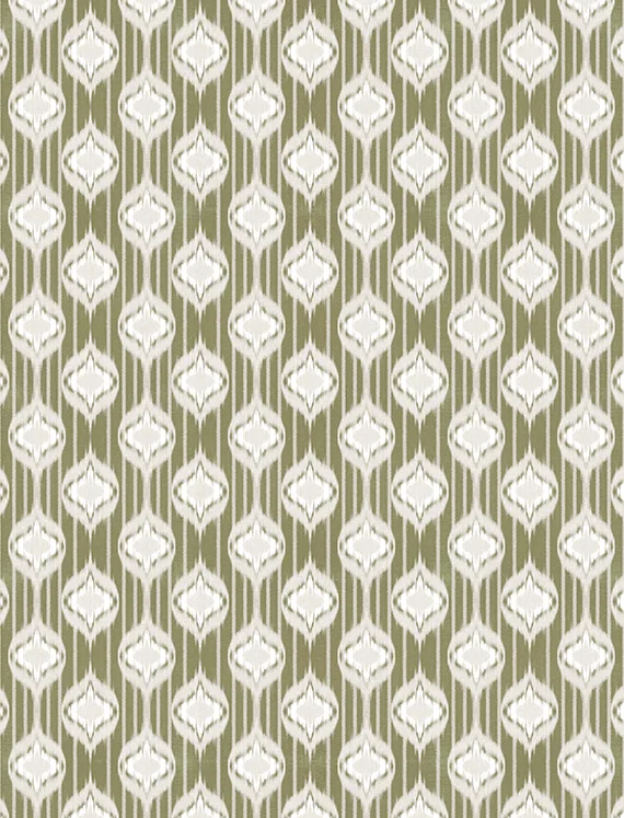 Inspired by the timeless beauty of traditional Ikat weaving, this wallpaper features repeating ogee-like motifs in a soft green and off-white palette.