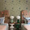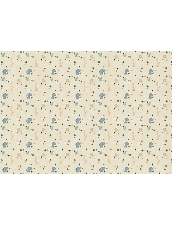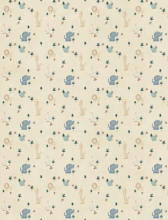 A lion with a lazy grin, elephants in soft blue, hens, snails, and party-hat-wearing giraffes frolic across a field of leafy shapes and simple trees. With its muted tones and cartoon charm, this wallpaper is a sweet celebration of gentle creatures. It brings a calm, playful warmth to the room, ideal for cozy corners and quiet joy.