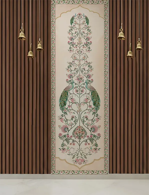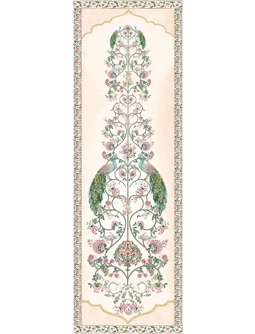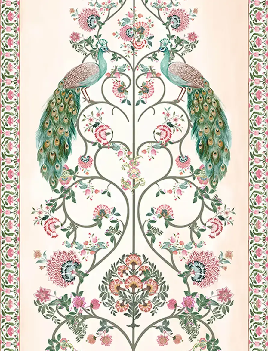 An ornate miniature-style composition featuring graceful peacocks and intricate florals – a richly layered design that exudes elegance, artistry, and timeless sophistication.