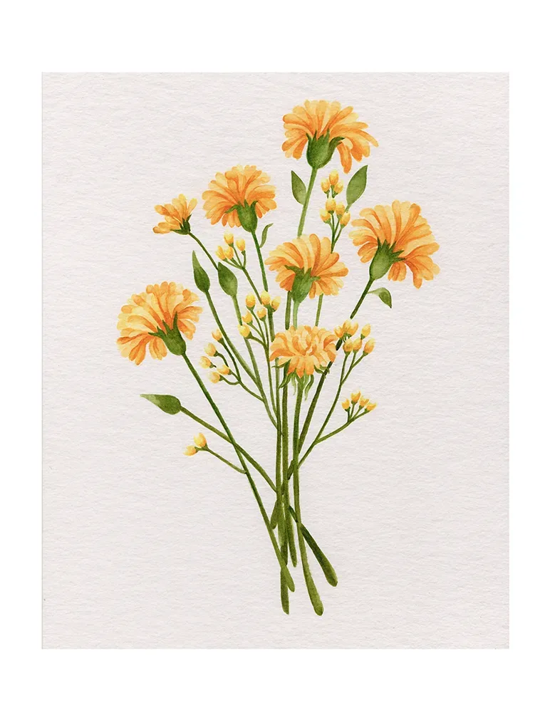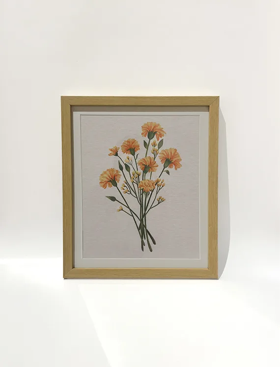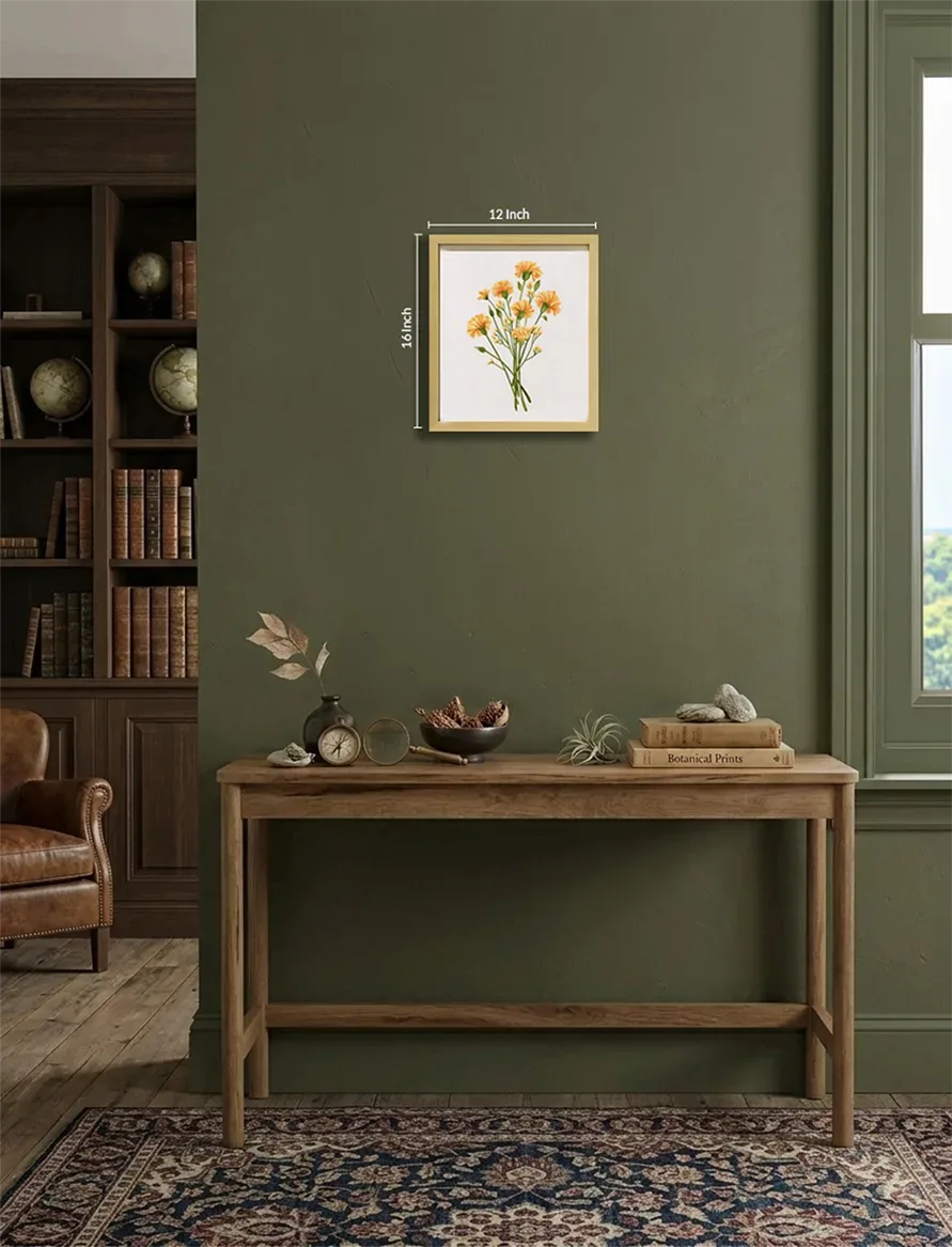 A cheerful cluster of golden marigolds, handpainted and digitally preserved — this framed print brings warmth and festive charm to any room.