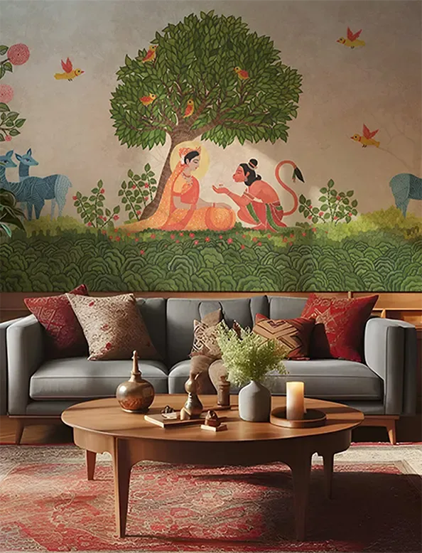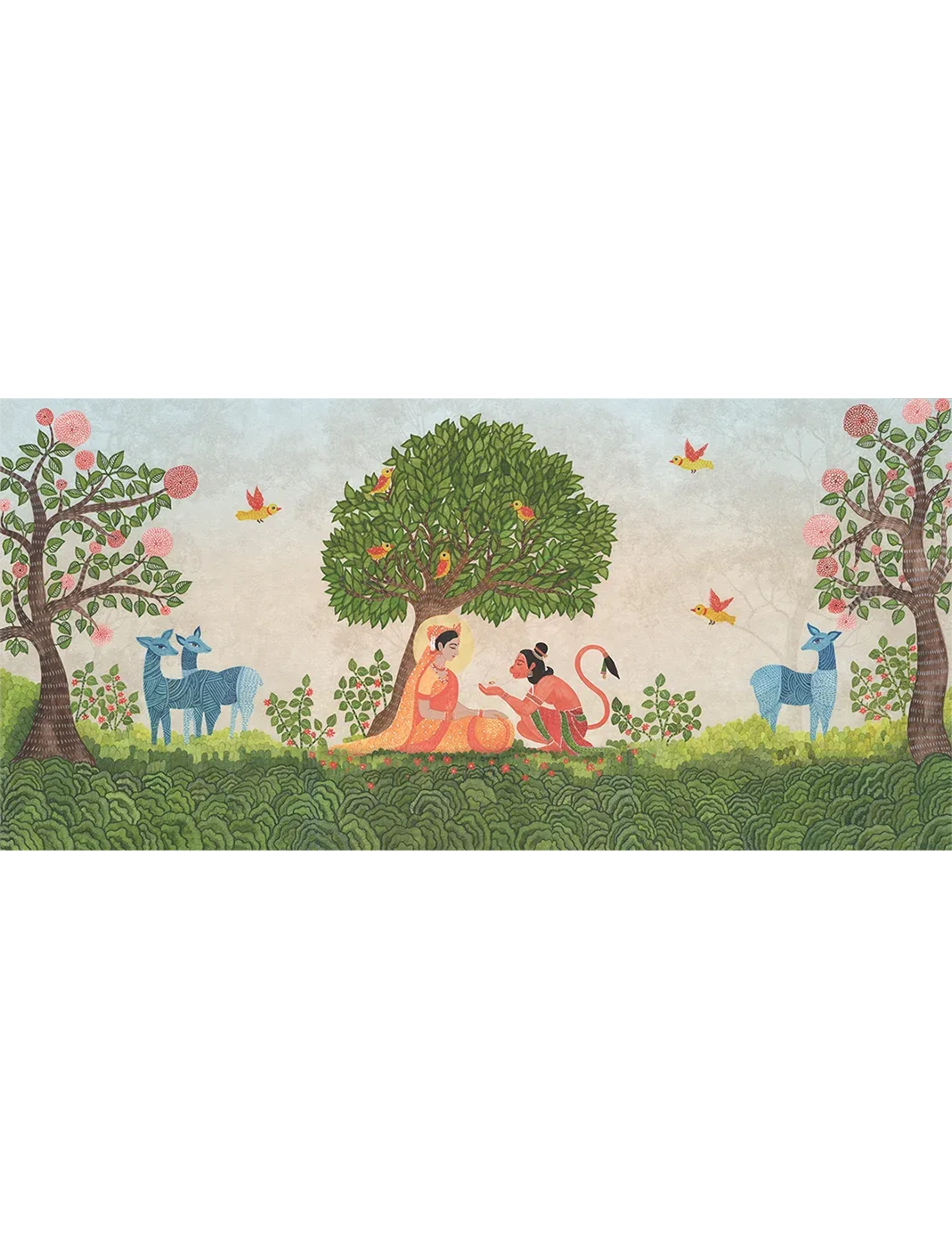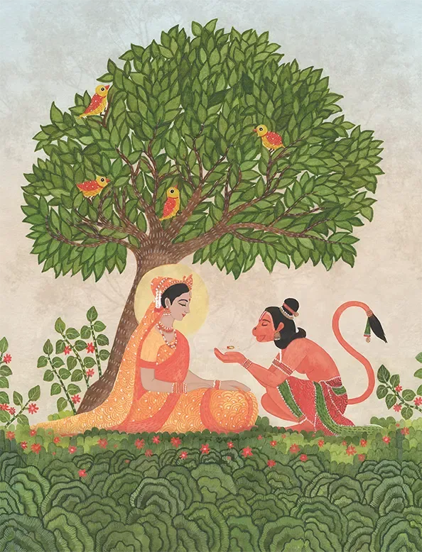 This artwork beautifully reimagines the mythical meeting of Sita and Hanuman in Ashok Vatika. The palette evokes a a mood that is at once tender, spiritual and timeless