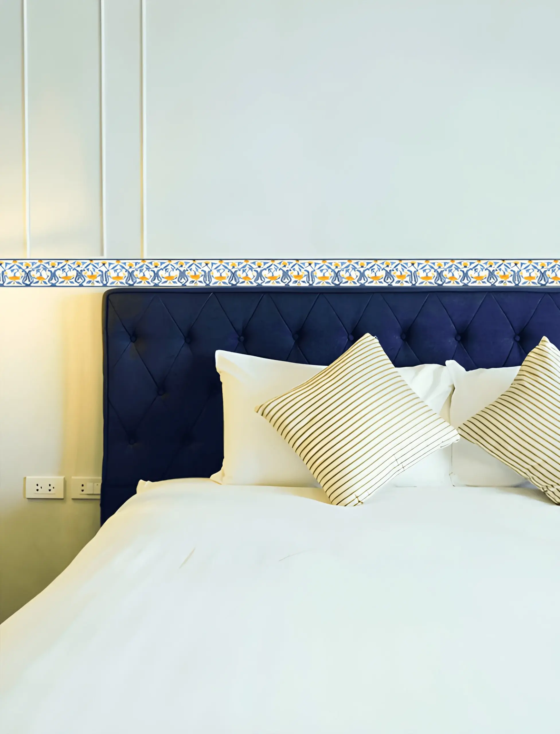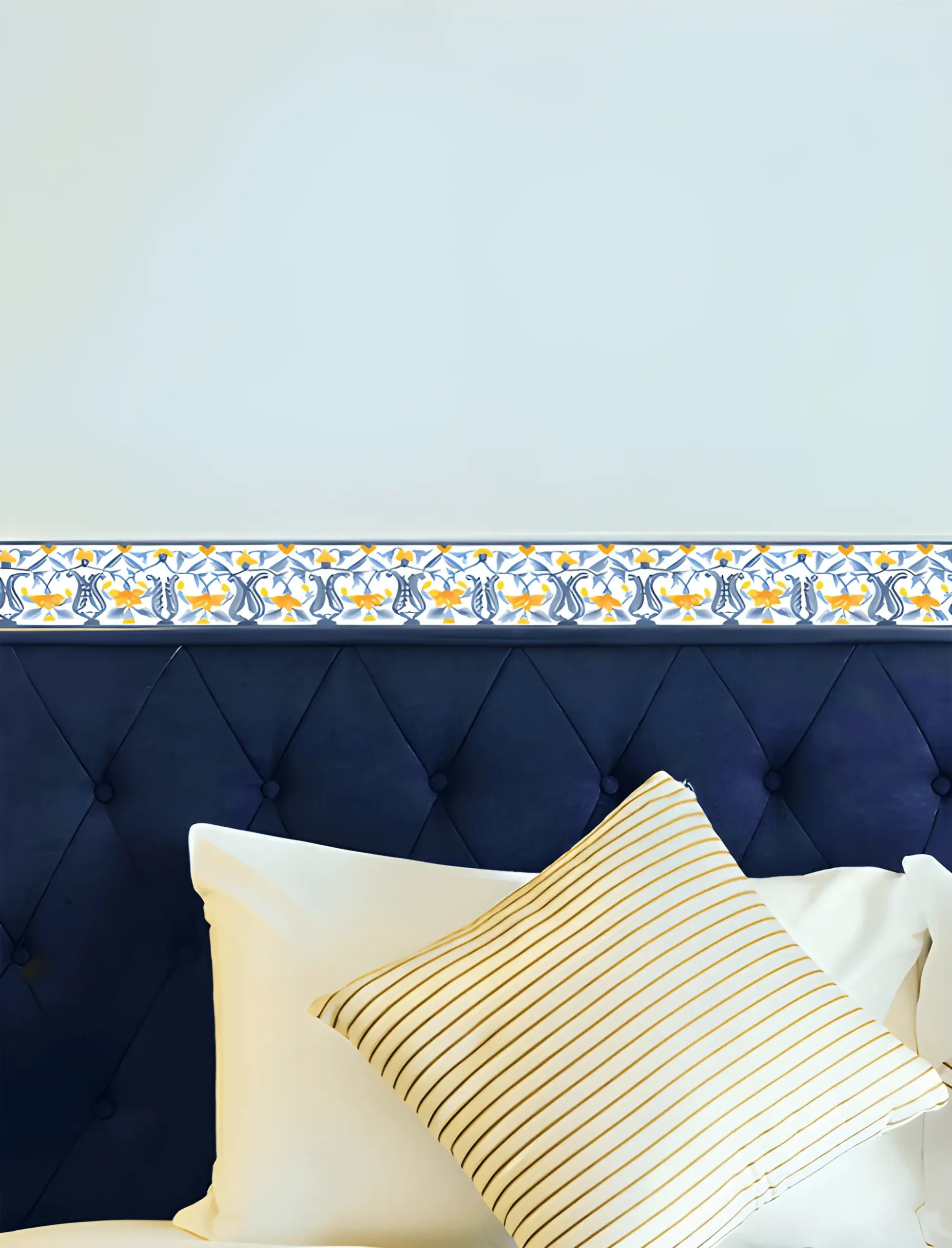 Bold yet elegant, this vibrant border decal features amber florals and indigo flourishes — a striking addition that enlivens plain walls with ornate charm.