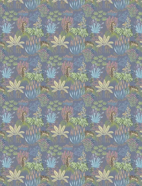 Playful leopards with elongated limbs and inky spots lounge among tropical palms and abstract shapes in calming tones of green, blue, and sand. The hand-drawn style adds a touch of whimsy, while hints of water and sky bring a breezy freshness. This wallpaper creates a vibrant, storybook safari look that feels both fun and stylish.