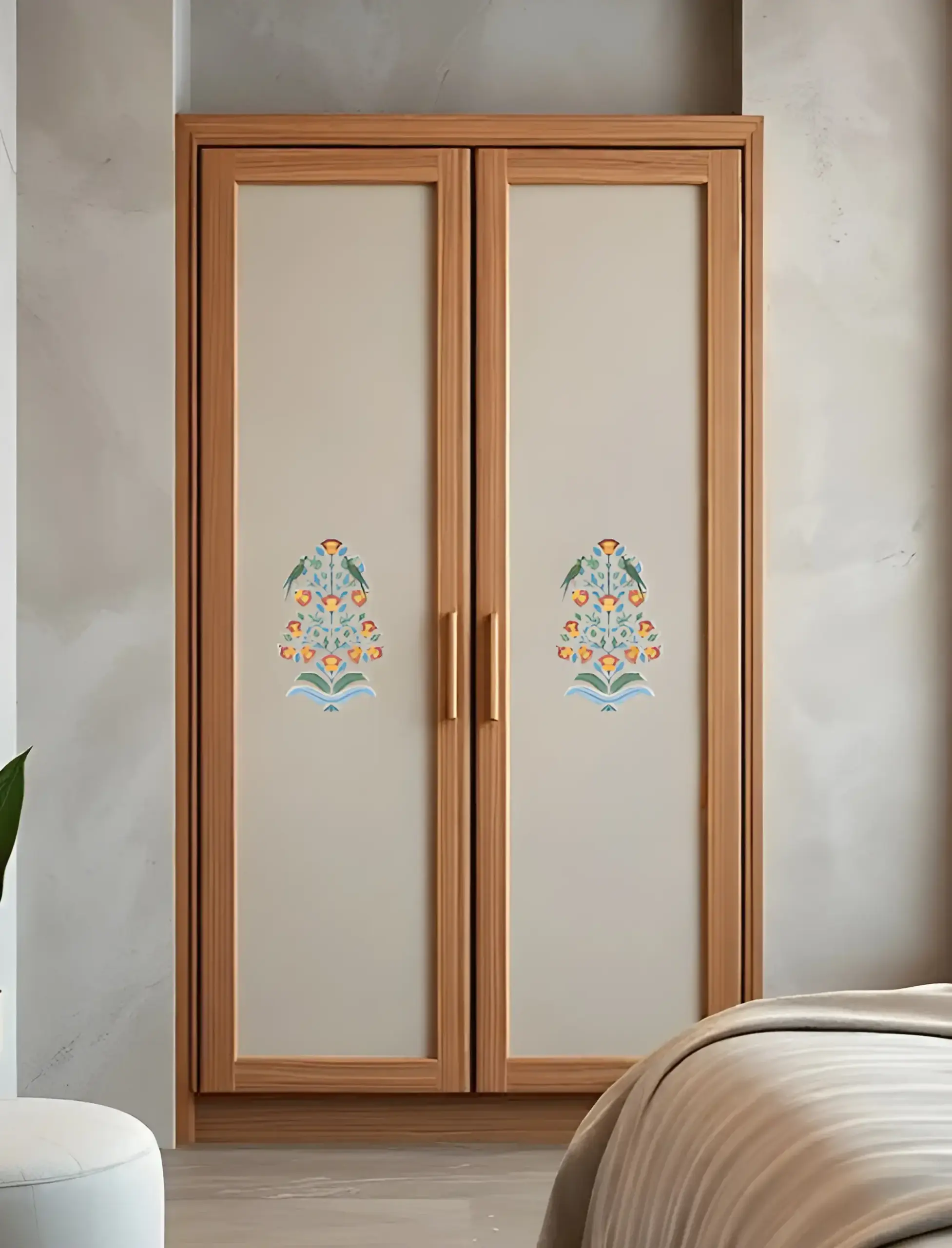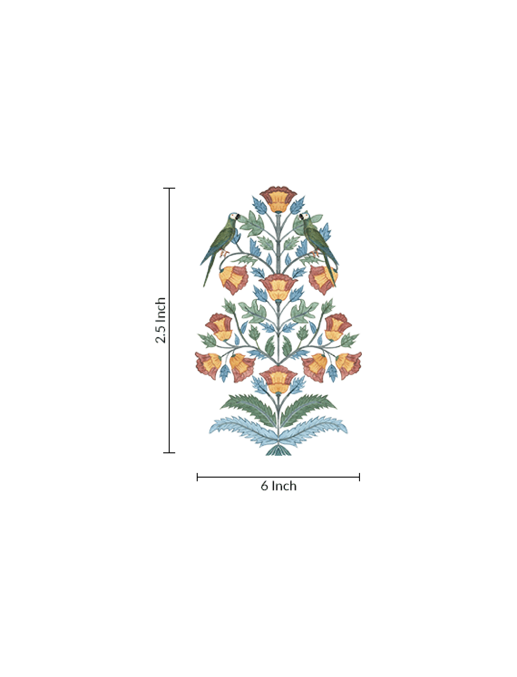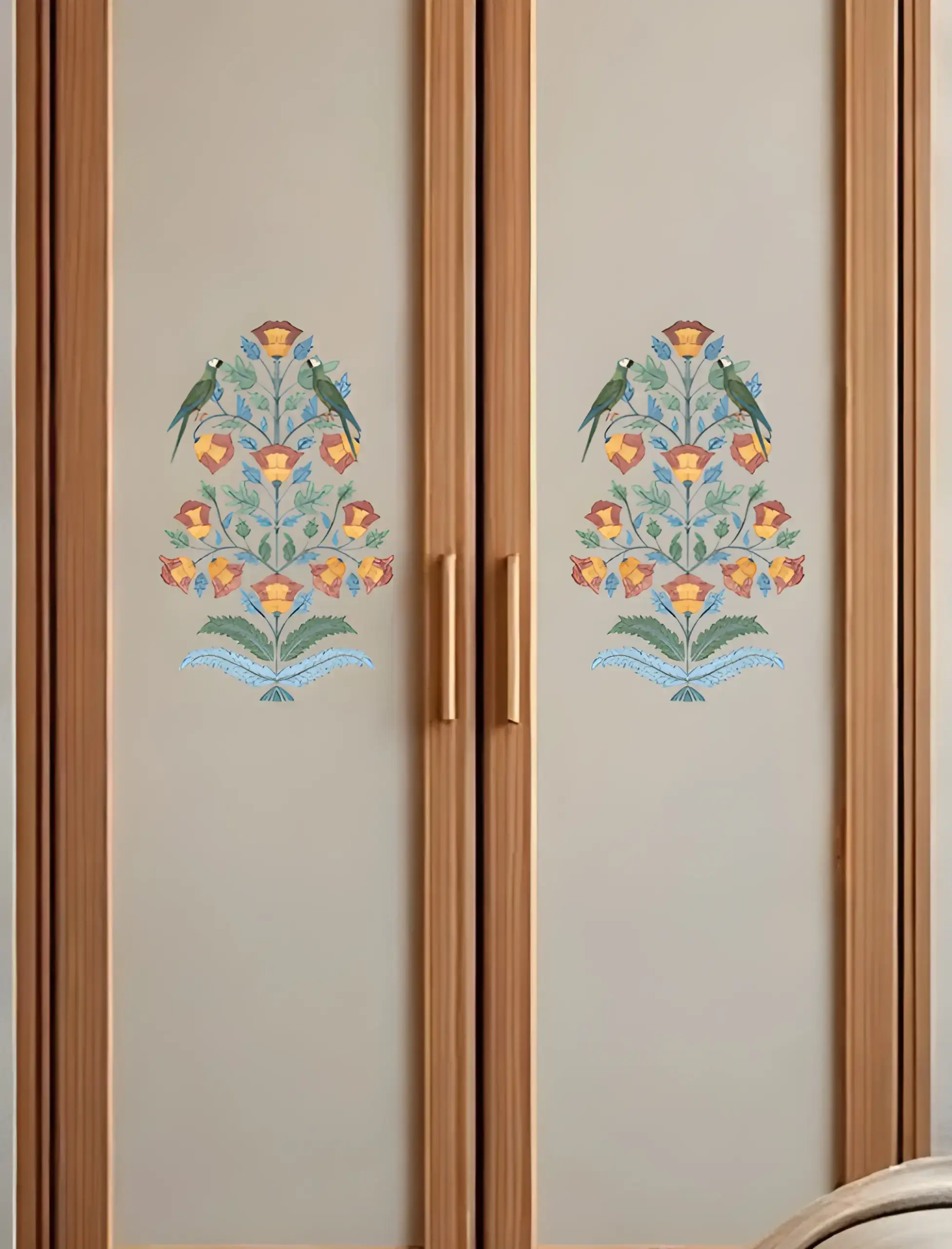 Two perched parrots amidst golden blooms and teal foliage, this nature-rich decal channels classic garden artistry with a tropical twist.