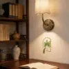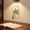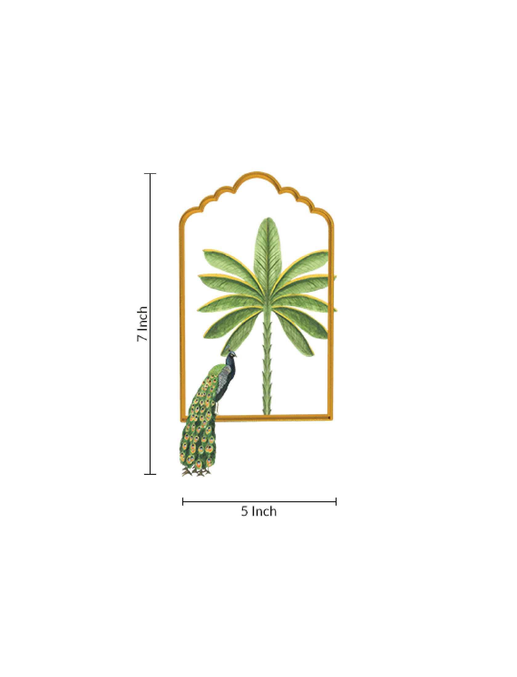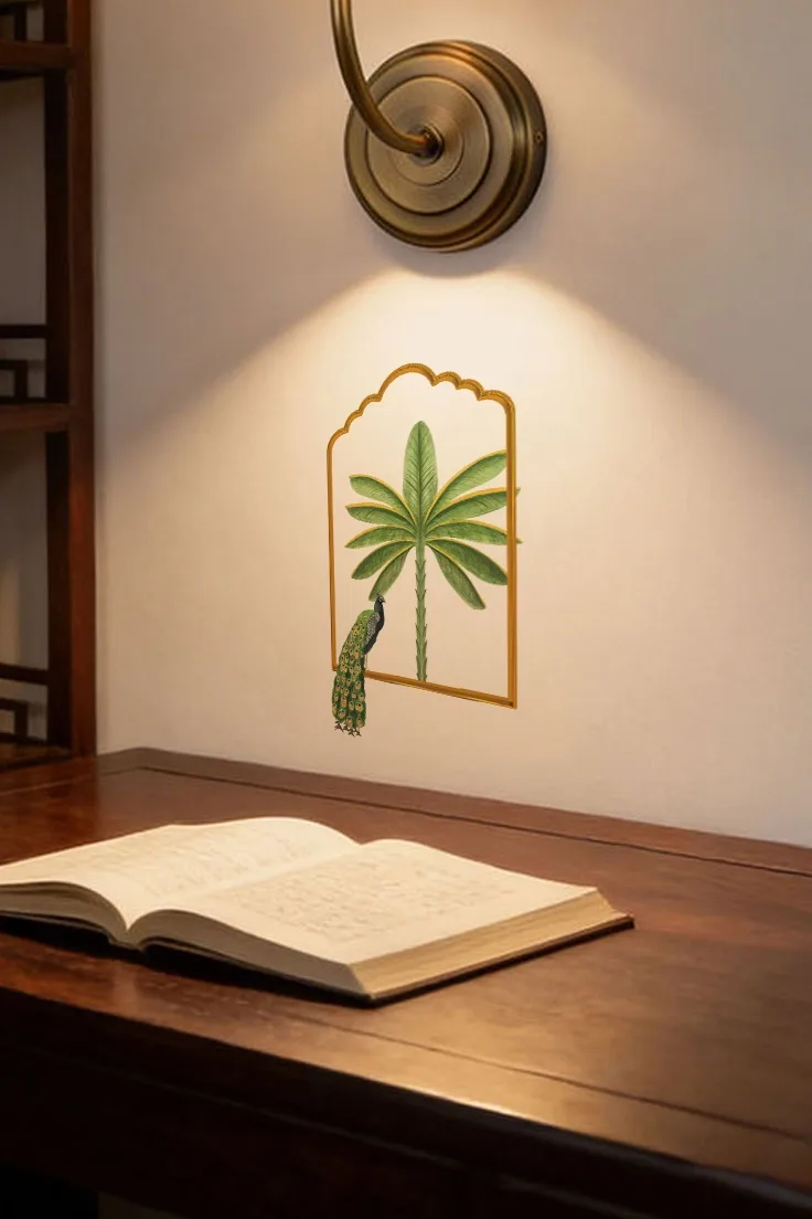 A vibrant peacock stands gracefully by a tropical palm, framed in a golden arch — perfect for bringing opulence and nature indoors.