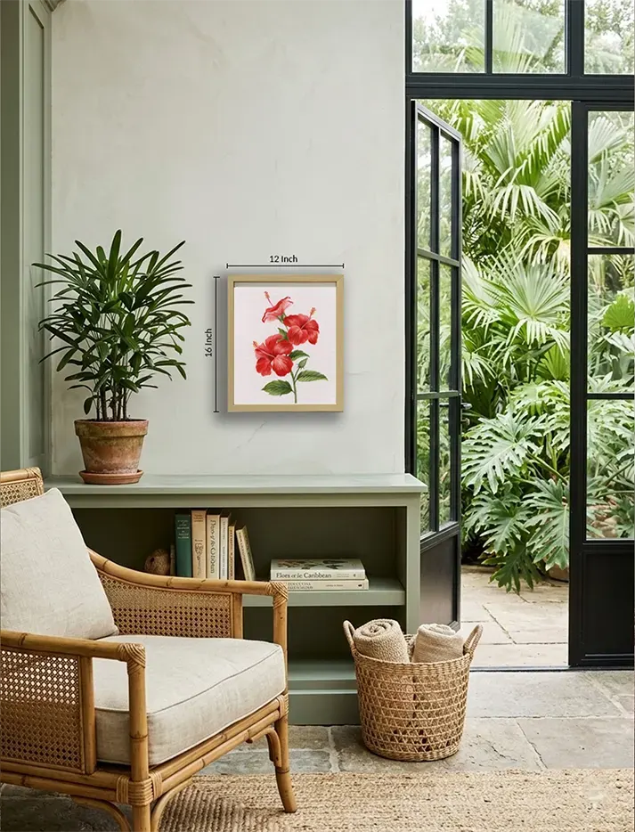 This bold hibiscus composition in fiery reds adds tropical vibrance to your space — a true-to-brushstroke digital reproduction of the original artwork.