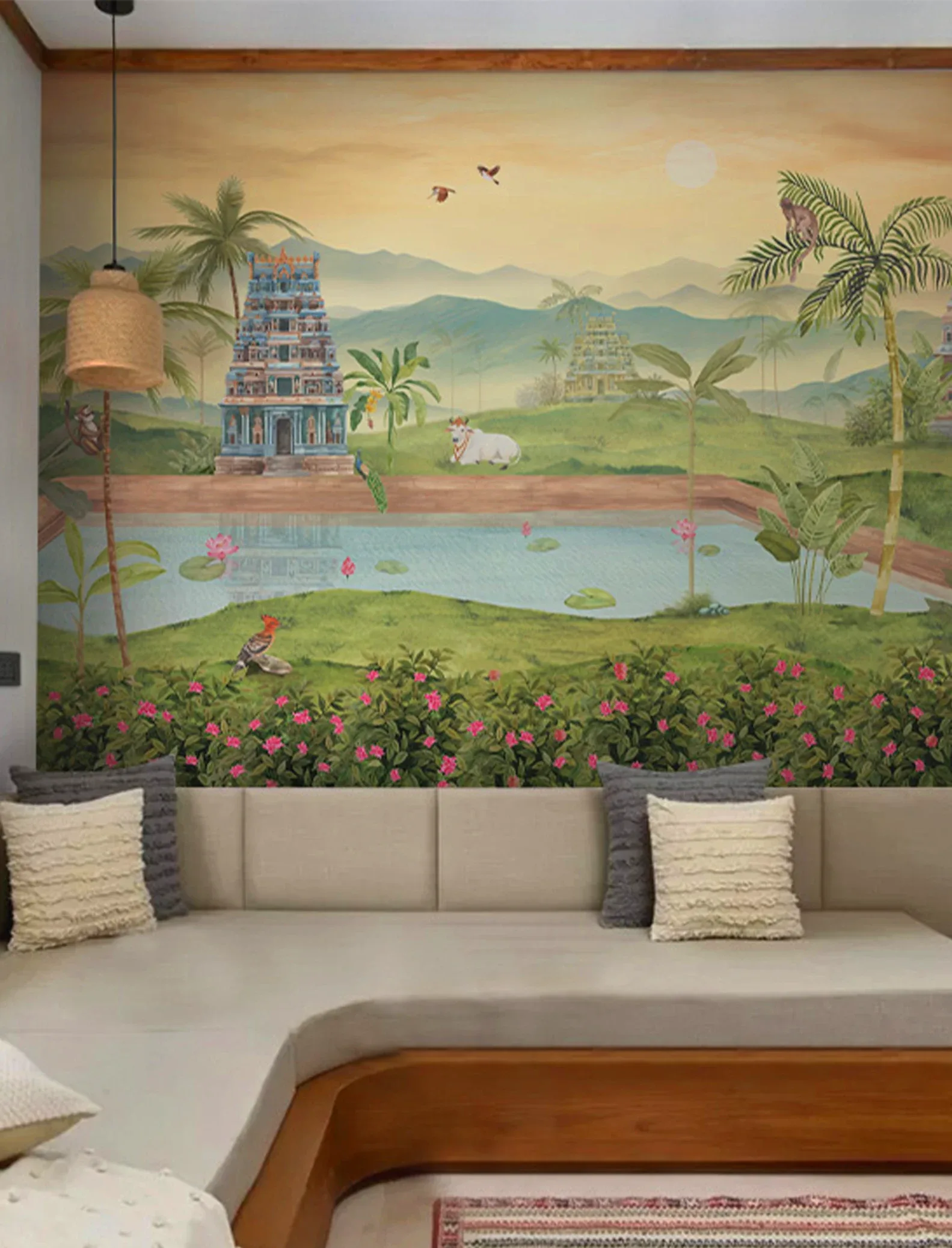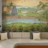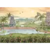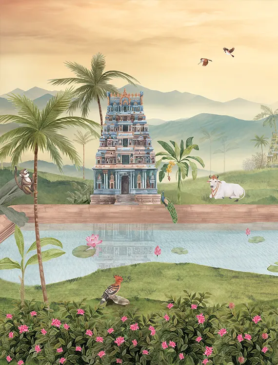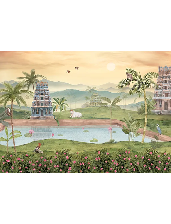 A tranquil mural where temples meet water, brought to life with gentle movement and soaring birds.