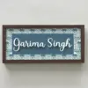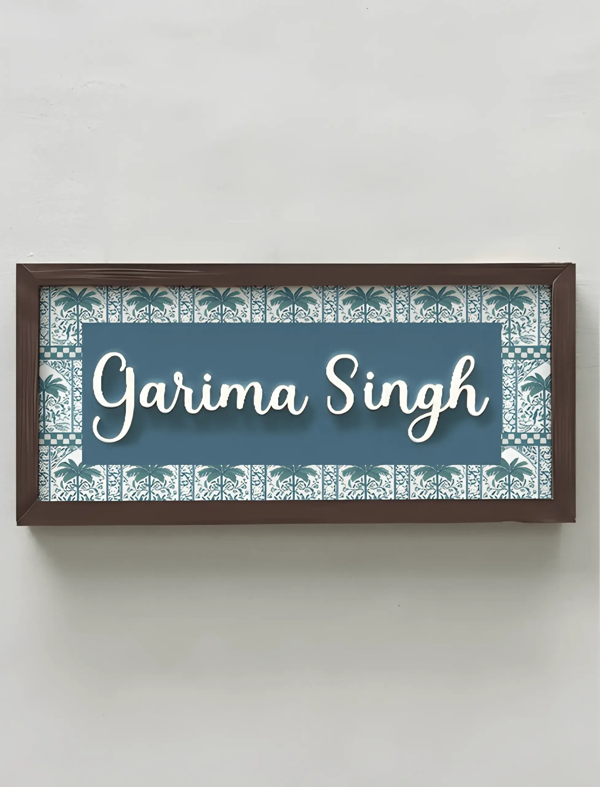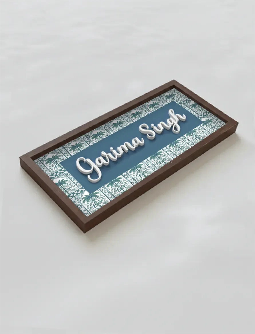 This design channels breezy colonial charm with its symmetrical palm trees, delicate vines, and tiled pattern. The intricate frame has the grace of vintage block prints, while the denim-blue panel anchors it in elegance. A tropical escape for your doorway, fresh, balanced, and timeless.
