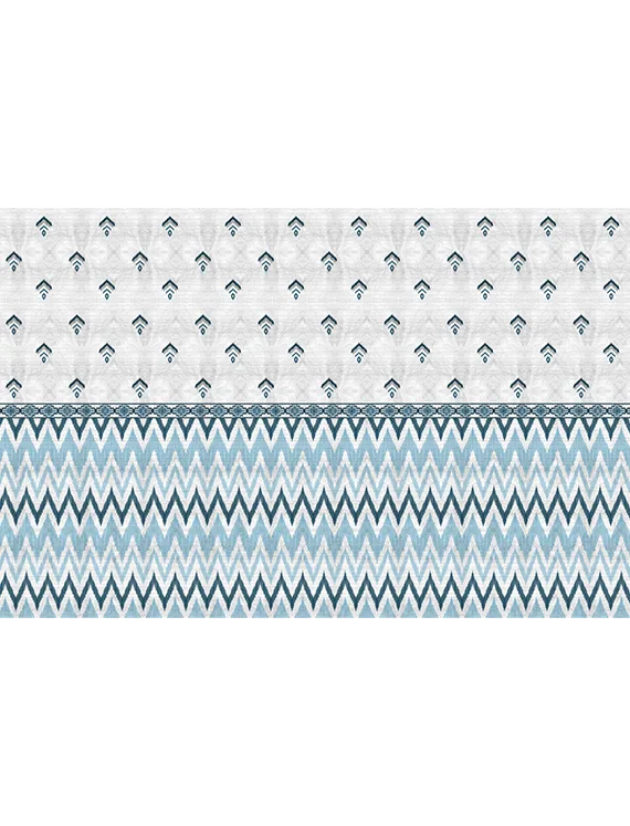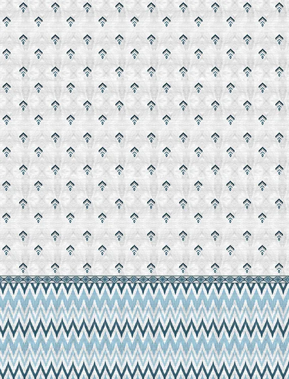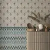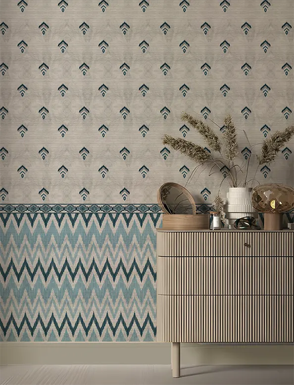 An elegant reimagining of Ikat tradition, this wallpaper showcases chevron and diamond motifs in muted blues and greens, exuding calm and cohesion.