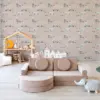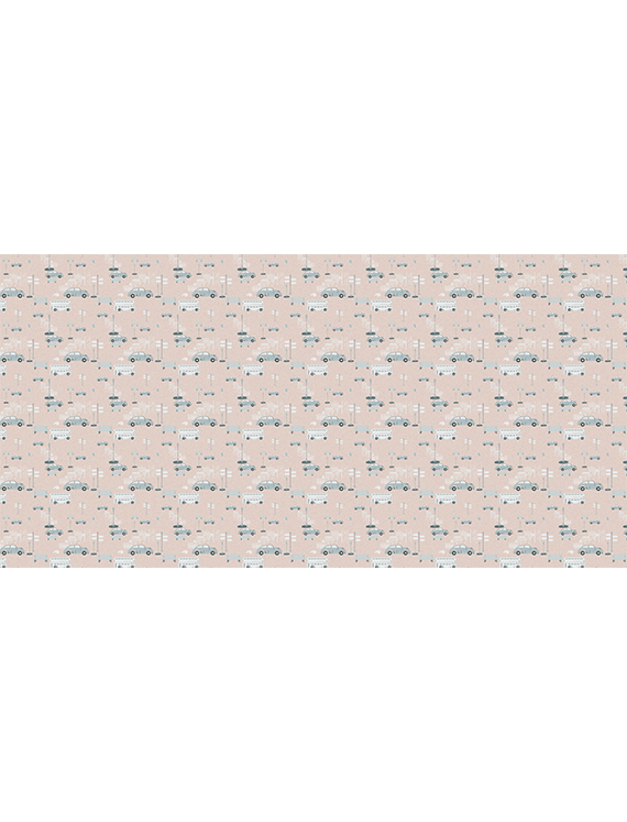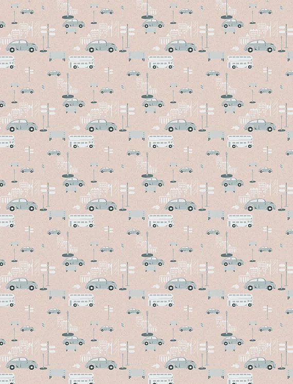 Vintage cars cruise past quaint benches and tall streetlamps in this charming, cityscape-inspired design. Soft blue tones and rounded shapes lend a gentle, nostalgic feel, while the clean spacing keeps it calm and tidy. This wallpaper adds a dreamy, retro-city vibe to any space, perfect for curious minds and peaceful playtime drives.
