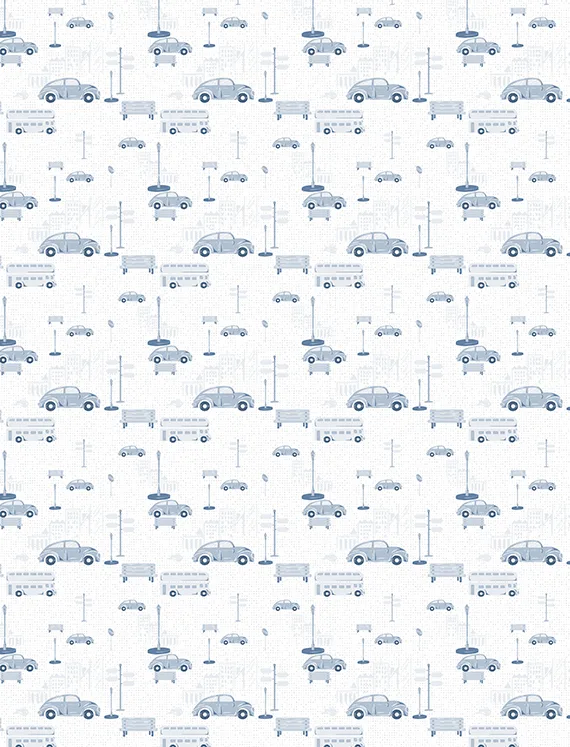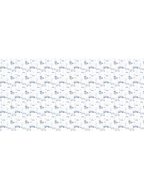 Vintage cars cruise past quaint benches and tall streetlamps in this charming, cityscape-inspired design. Soft blue tones and rounded shapes lend a gentle, nostalgic feel, while the clean spacing keeps it calm and tidy. This wallpaper adds a dreamy, retro-city vibe to any space, perfect for curious minds and peaceful playtime drives.